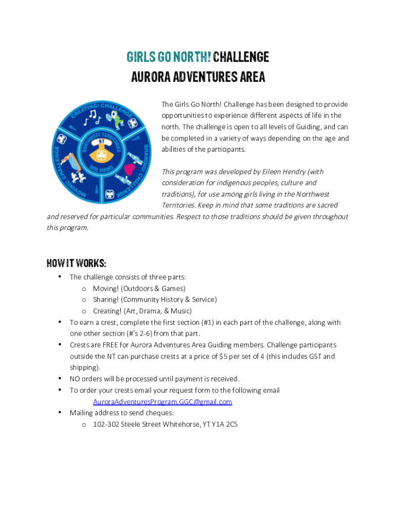 GIRLS GO NORTH! CHALLENGE AURORA ADVENTURES AREA The Girls Go North! Challenge has been designed to provide opportunities to experience different aspects of life in the north. The challenge is open