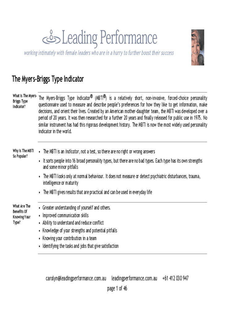 Working intimately with female leaders who are in a hurry to further boost their successive Myers-Briggs Type Indicator What Is The Myers-Briggs Type Indicator? The Myers-Briggs Type Indicator (MBTI)