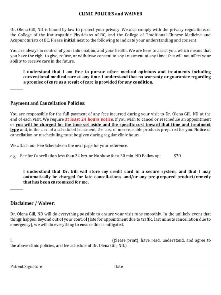 CLINIC POLICIES and WAIVER Dr. Elena Gill, ND is bound by law to protect your privacy. We also comply with the privacy regulations oftheCollegeoftheNaturopathicPhysiciansofBC, andtheCollegeofTraditionalChineseMedicineandAcupuncturists