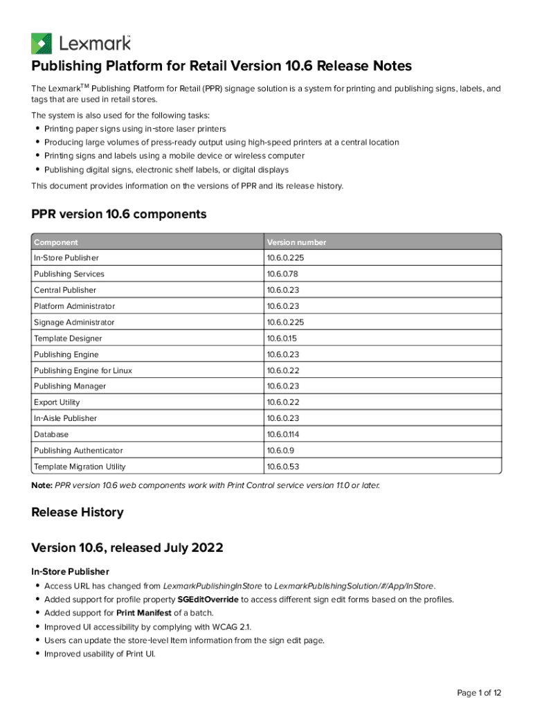 Publishing Platform for Retail Version 10.6 Release Notes The LexmarkTM Publishing Platform for Retail (PPR) signage solution is a system for printing and publishing signs, labels, and tags that are