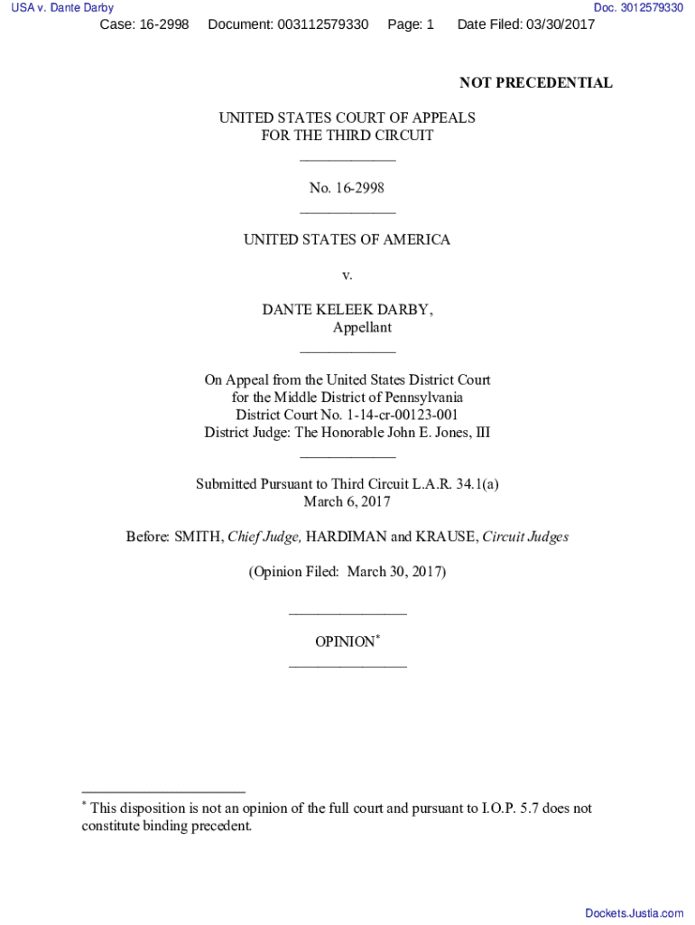 Get the free NOT PRECEDENTIAL OPINION Coram. 16-2998 - USA v. Dante Darby