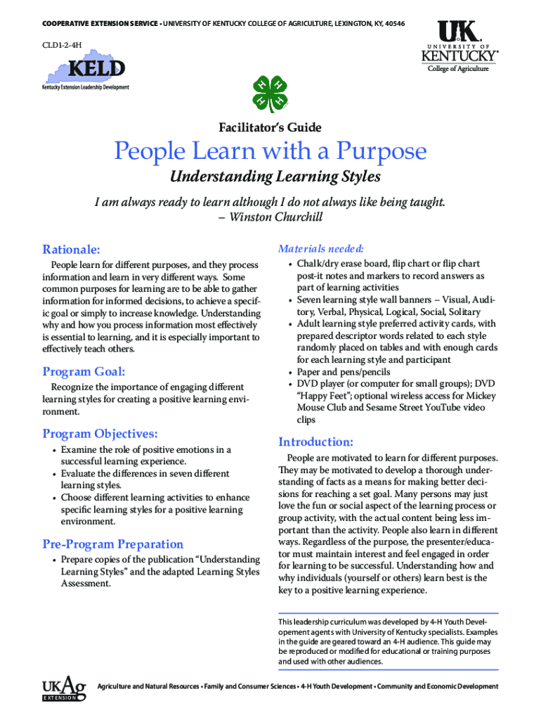 COOPERATIVE EXTENSION SERVICE UNIVERSITY OF KENTUCKY COLLEGE OF AGRICULTURE, LEXINGTON, KY, 40546CLD124HFacilitators GuidePeople Learn with a Purpose Understanding Learning Styles am always ready