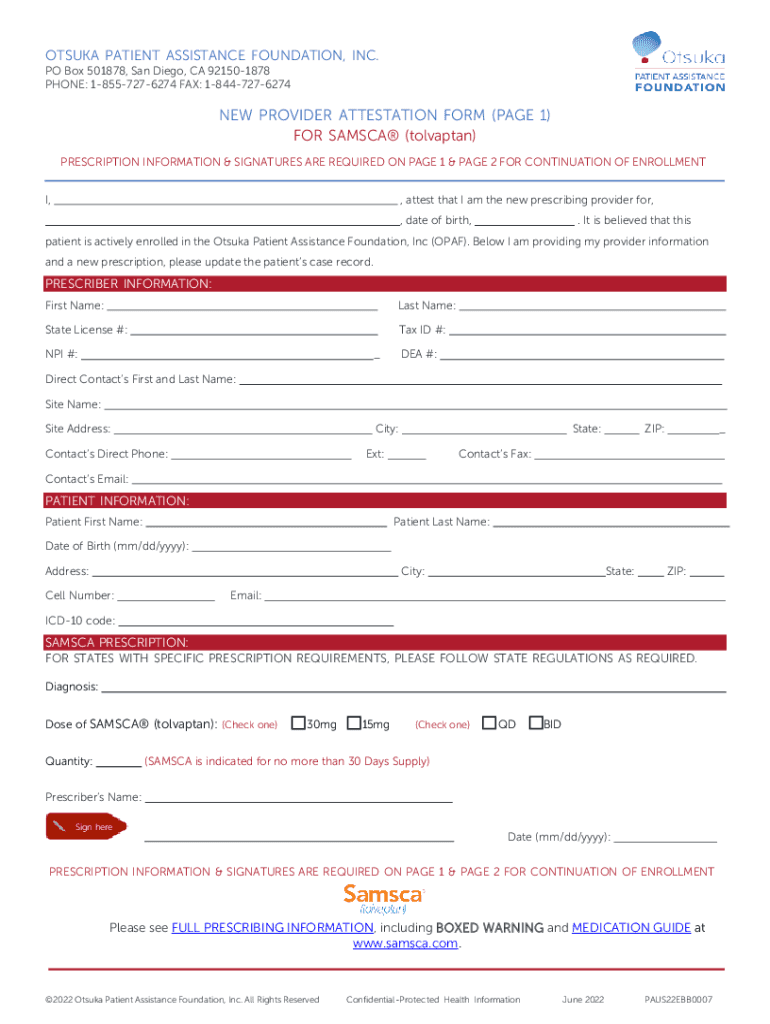 OSAKA PATIENT ASSISTANCE FOUNDATION, INC. PO Box 501878, San Diego, CA 921501878 PHONE: 18557276274 FAX: 18447276274NEW PROVIDER ATTESTATION FORM (PAGE 1) FOR () PRESCRIPTION INFORMATION & SIGNATURES
