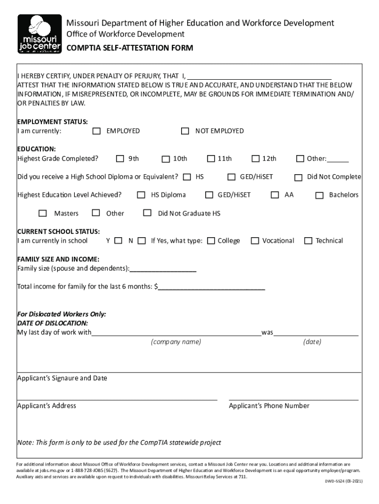 Missouri Department of Higher Education and Workforce Development Office of Workforce DevelopmentCOMPTIA SELFATTESTATION FORM I HEREBY CERTIFY, UNDER PENALTY OF PERJURY, THAT I, ___ ATTEST THAT THE