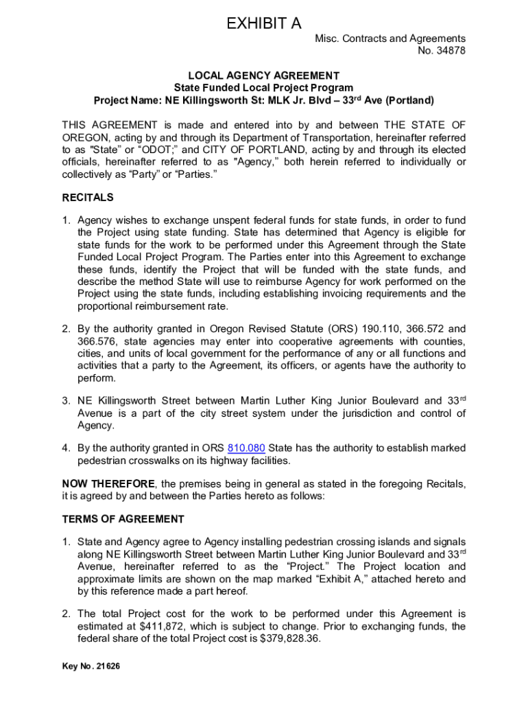EXHIBIT Amish. Contracts and Agreements No. 34878LOCAL AGENCY AGREEMENT State Funded Local Project Program Project Name: NE Killings worth St: MLK Jr. Blvd 33rd Ave (Portland) THIS AGREEMENT is made