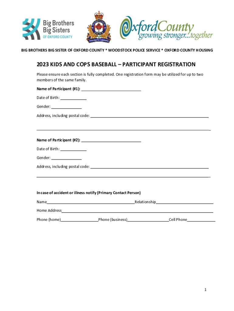 BIG BROTHERS BIG SISTER OF OXFORD COUNTY * WOODSTOCK POLICE SERVICE * OXFORD COUNTY HOUSING2023 KIDS AND COPS BASEBALL PARTICIPANT REGISTRATION Please ensure each section is fully completed. One registration