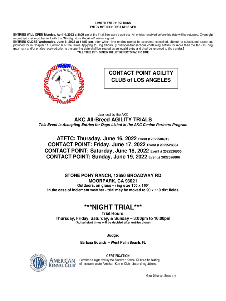 LIMITED ENTRY: 350 RUNS ENTRY METHOD: FIRST RECEIVED ENTRIES WILL OPEN Monday, April 4, 2022, at 8:00 am at the Trial Secretary's address. All entries received before this date will be returned. Overnight
