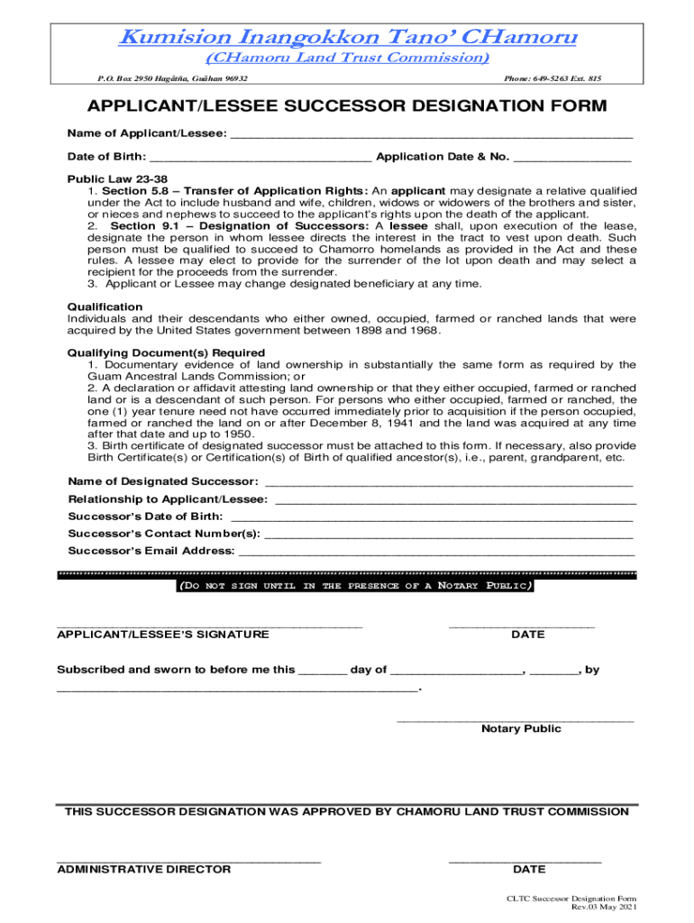 (Chamois Land Trust Commission)P.O. Box 2950 Hag ta, Wuhan 96932Phone: 6495263 Ext. 815APPLICANT/LESSEE SUCCESSOR DESIGNATION FORM