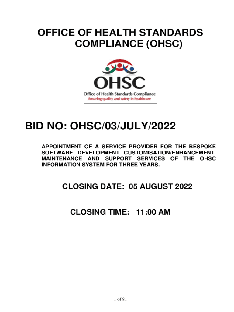 OFFICE OF HEALTH STANDARDS COMPLIANCE (OHS)BID NO: OHS/03/JULY/2022 APPOINTMENT OF A SERVICE PROVIDER FOR THE BESPOKE SOFTWARE DEVELOPMENT Customization/ENHANCEMENT, MAINTENANCE AND SUPPORT SERVICES