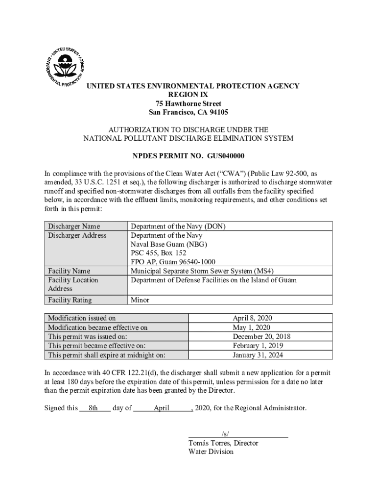 Get the free NPDES Permit No. GUS040000 Modification. Modified authorization to Discharge Under N...