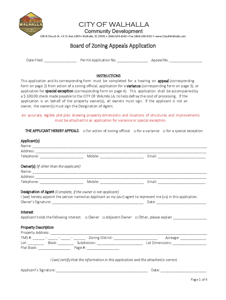 CITY OF VALHALLA Community Development206 N Church St. P.O. Box 1099 Valhalla, SC 29691 (864) 6384343 Fax (864) 6384357 www.CityofWalhalla.comBoard of Zoning Appeals Application Date Filed: ___ Permit
