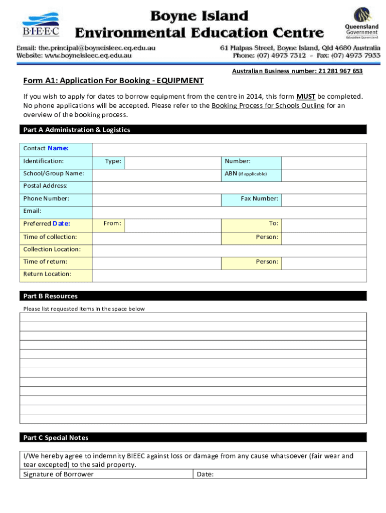 Australian Business number: 21 281 967 653Form A1: Application For Booking EQUIPMENT If you wish to apply for dates to borrow equipment from the center in 2014, this form MUST be completed. No phone