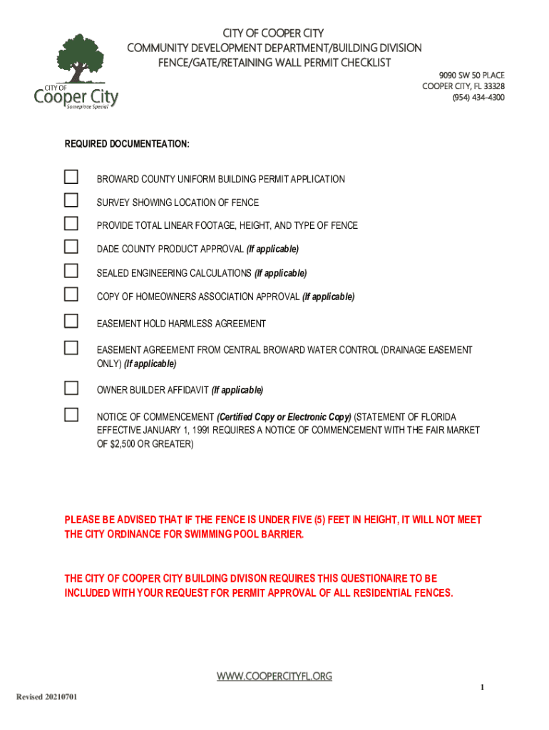 CITY OF COOPER CITY COMMUNITY DEVELOPMENT DEPARTMENT/BUILDING DIVISION FENCE/GATE/RETAINING WALL PERMIT CHECKLIST9090 SW 50 PLACE COOPER CITY, FL 33328 (954) 4344300REQUIRED DOCUMENTATION: ___BROWARD