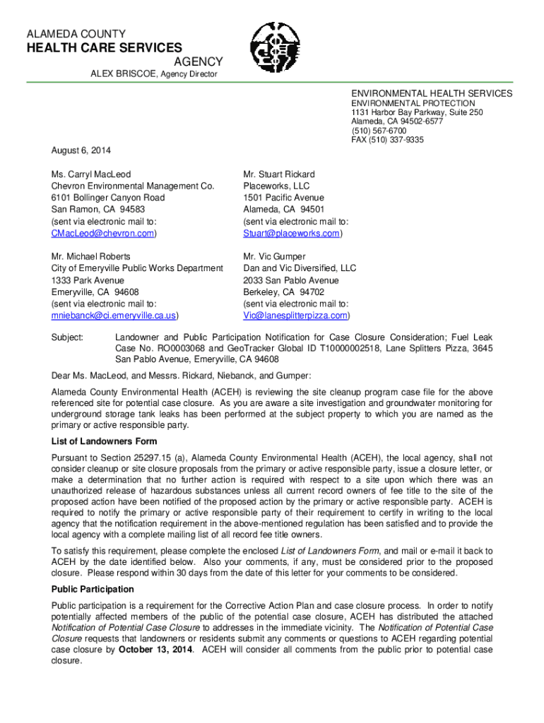 ALAMEDA COUNTYHEALTH CARE SERVICES AGENCY ALEX BRISTOL, Agency Director ENVIRONMENTAL HEALTH SERVICES ENVIRONMENTAL PROTECTION 1131 Harbor Bay Parkway, Suite 250 Alameda, CA 945026577 (510) 5676700