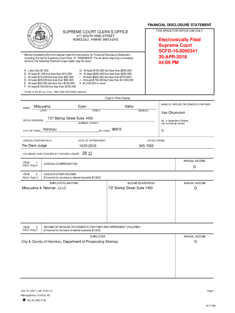 FINANCIAL DISCLOSURE STATEMENTSUPREME COURT CLERKS OFFICERS SPACE FOR OFFICE USE ONLY417 SOUTH KING STREET HONOLULU, HAWAII 968132912Electronically Filed Supreme Court SCFD160000341 30APR2018 04:09