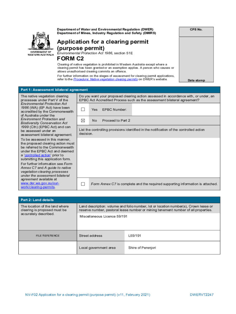 Department of Water and Environmental Regulation (DEER) Department of Mines, Industry Regulation and Safety (EMIRS)CPS No. Application for a clearing permit (purpose permit) Environmental Protection