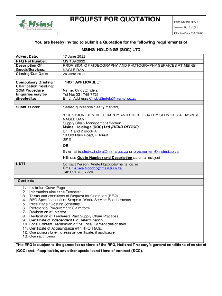 REQUEST FOR QUOTATIONForm No: MHRFQ1 Version No: 01/2021 EffectiveDate:01/06/2021You are hereby invited to submit a Quotation for the following requirements of MSIN SI HOLDINGS (SOC) LTD Advert Date:
