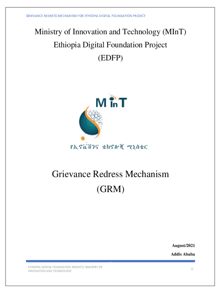 GRIEVANCE REDRESS MECHANISM FOR ETHIOPIA DIGITAL FOUNDATION PROJECTMinistry of Innovation and Technology (Mint) Ethiopia Digital Foundation Project (EDP)Grievance Redress Mechanism (ARM)August/2021