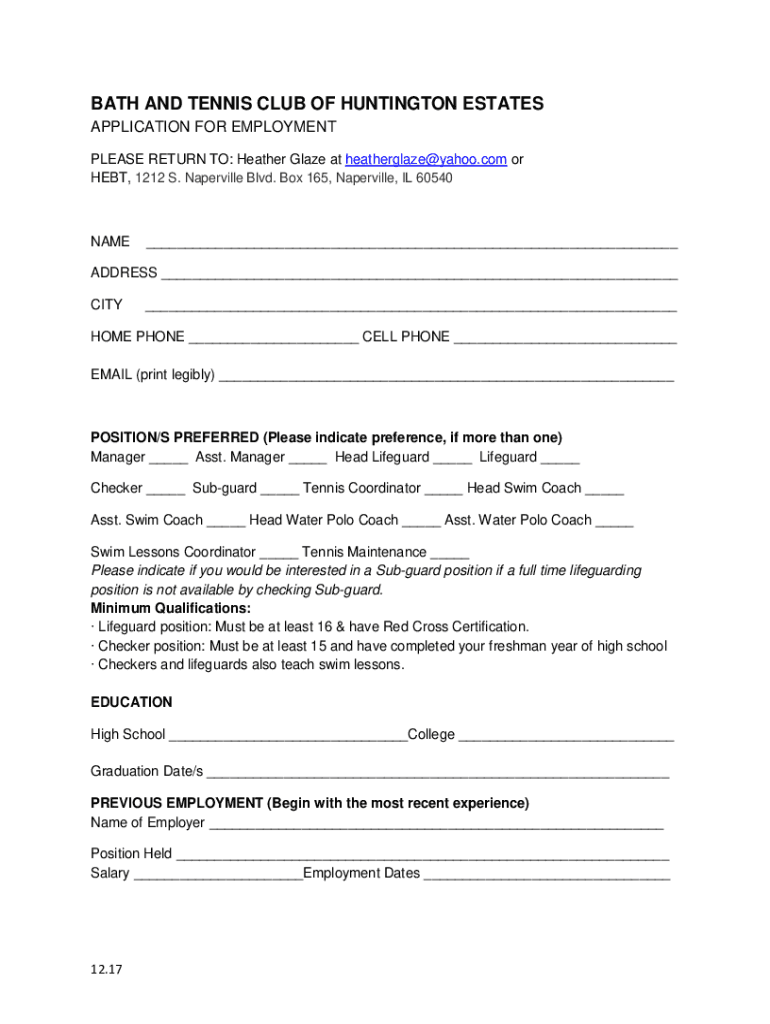 BATH AND TENNIS CLUB OF HUNTINGTON ESTATES APPLICATION FOR EMPLOYMENT PLEASE RETURN TO: Heather Glaze at heatherglaze@yahoo.com or HEAT, 1212 S. Naperville Blvd. Box 165, Naperville, IL 60540NAME___ADDRESS