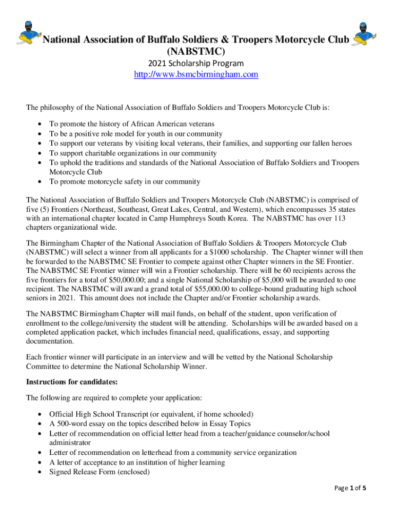National Association of Buffalo Soldiers & Troopers Motorcycle Club (NABS TMC) 2021 Scholarship Program http://www.bsmcbirmingham.comThe philosophy of the National Association of Buffalo Soldiers