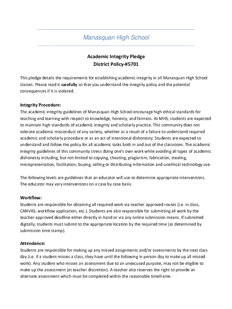 Managua High School Academic Integrity Pledge District Policy#5701 This pledge details the requirements for establishing academic integrity in all Managua High School classes. Please read it carefully