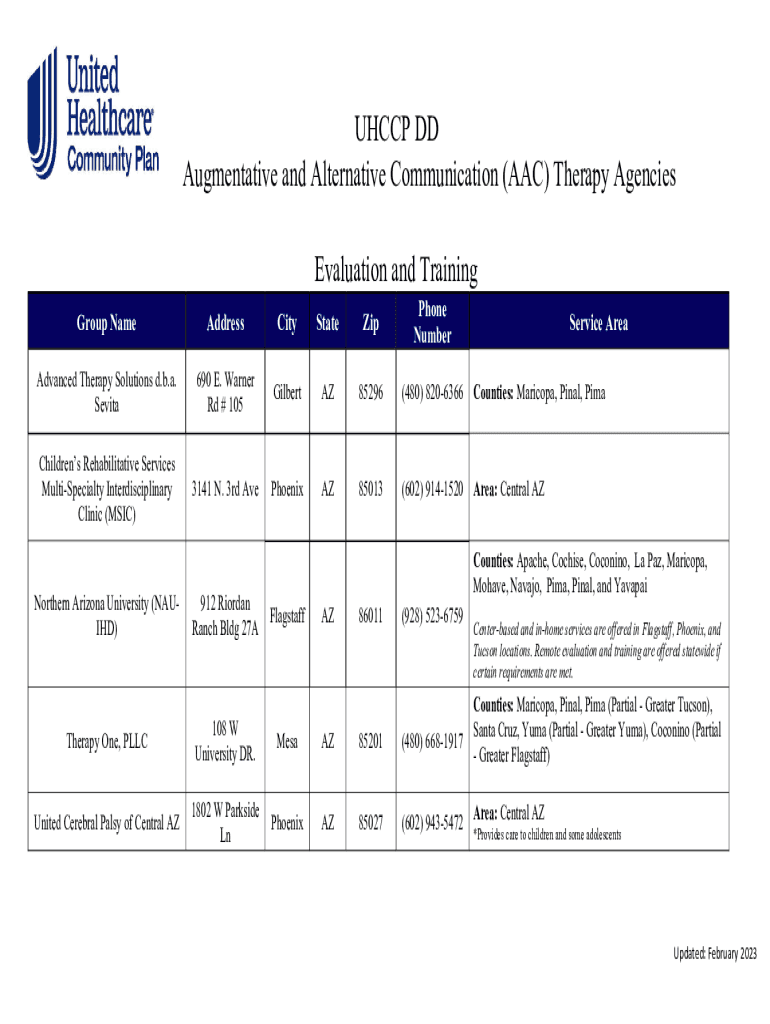 UH CCP DD Augmentative and Alternative Communication (AAC) Therapy Agencies Evaluation and Training Phone Supergroup NameAddressCityStateZipService Breakdanced Therapy Solutions d.b.a. Sevita690 E.