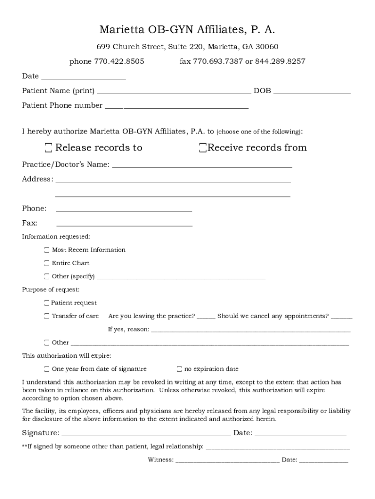 Marietta ORGAN Affiliates, P. A. 699 Church Street, Suite 220, Marietta, GA 30060 phone 770.422.8505fax 770.693.7387 or 844.289.8257Date ___ Patient Name (print) ___ DOB ___ Patient Phone number ___