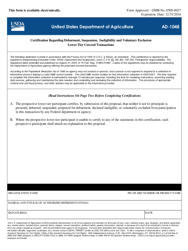 Obtain a copy of form AD 1048 USDA from the USDA website or office.