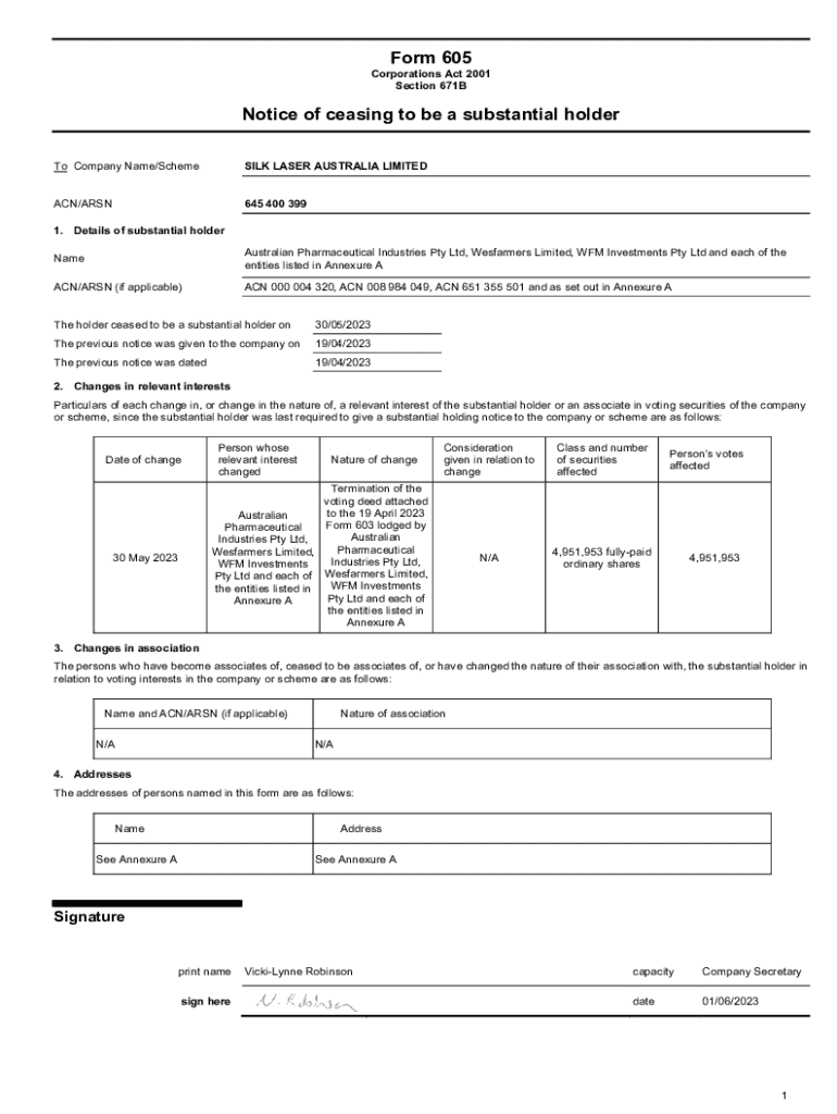 Form 605Corporations Act 2001 Section 671BNotice of ceasing to be a substantial holder To Company Name/Schemes LASER AUSTRALIA LIMITED ACN/ARSN645 400 3991. Details of substantial holder Name Australian