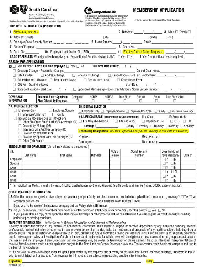 Membership application Registered Marks of the Blue Cross and Blue Shield Association, an Association of Independent Blue Cross and Blue Shield Plans. Employee information (Please Print) companion