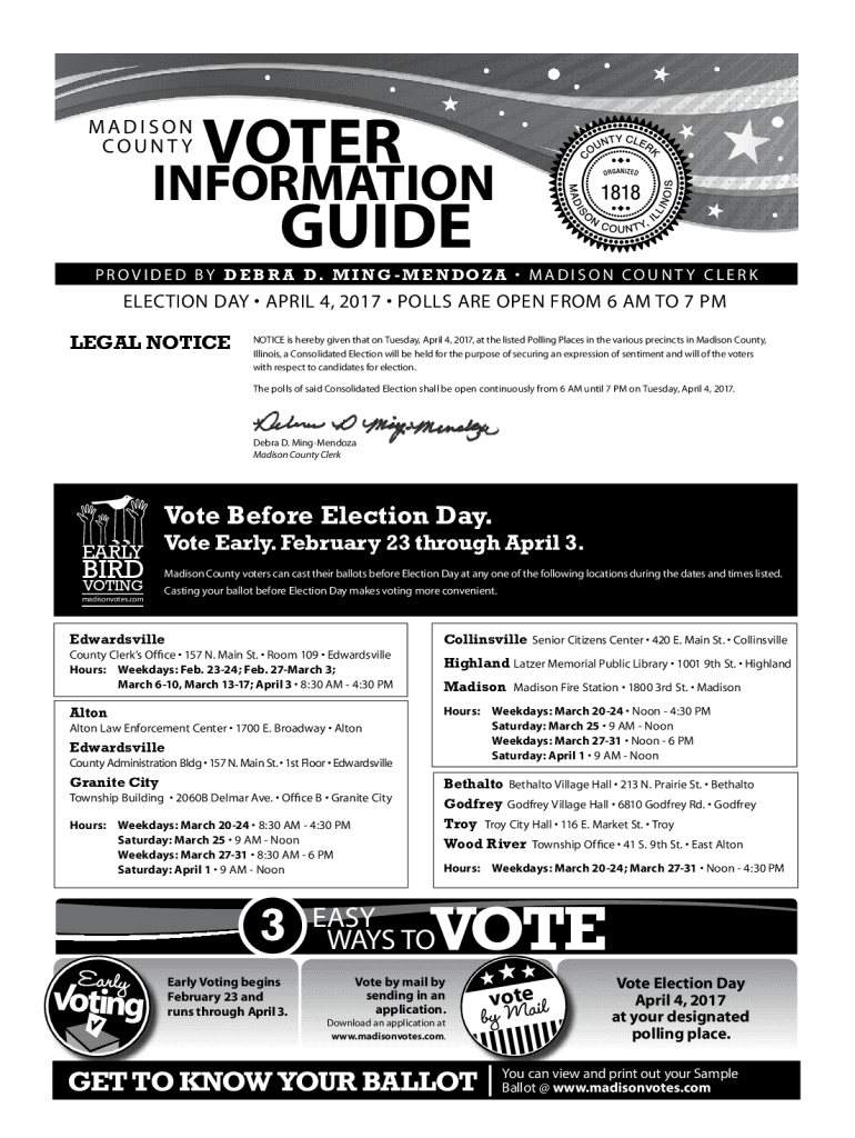 COUNT YP R O V I D E D B Y D E B R A D. M I N G M E N DO Z A M A D I S O N C O U N T Y C L E R ELECTION DAY APRIL 4, 2017, POLLS ARE OPEN FROM 6 AM TO 7 LEGAL NOTICENOTICE