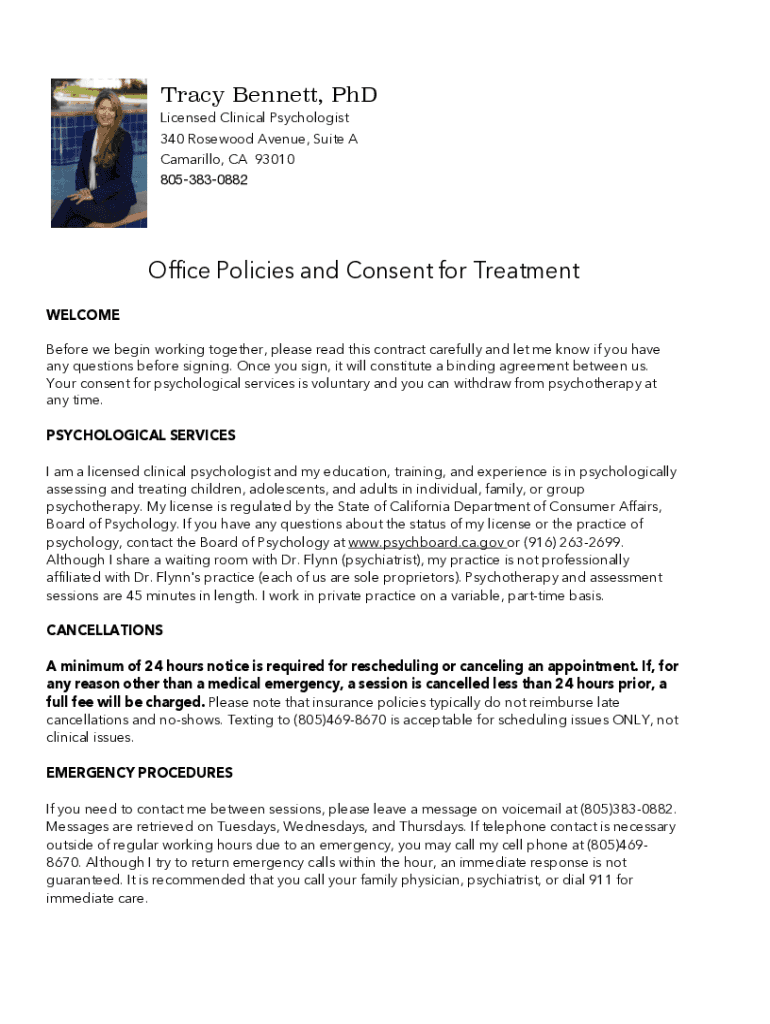 Tracy Bennett, PhD Licensed Clinical Psychologist 340 Rosewood Avenue, Suite A Camarillo, CA 93010 8053830882Office Policies and Consent for Treatment WELCOME Before we begin working together, please