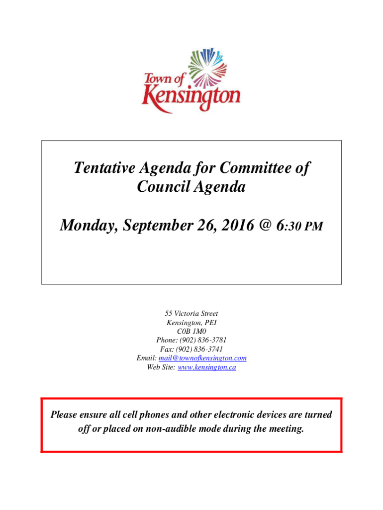 Tentative Agenda for Committee of Council Agenda Monday, September 26, 2016 @ 6:30 PM55 Victoria Street Kensington, PEI C0B 1M0 Phone: (902) 8363781 Fax: (902) 8363741 Email: mail@townofkensington.com