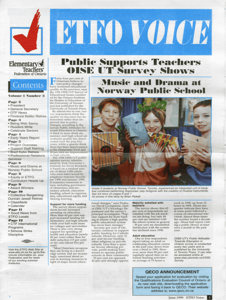 Elementary teachers\' Federation of OntarioPublic Supports Teachers OISE UT Survey Showsortyfour per cent of Ontarian's believe recent policy changes have worsened educational quality in the province,