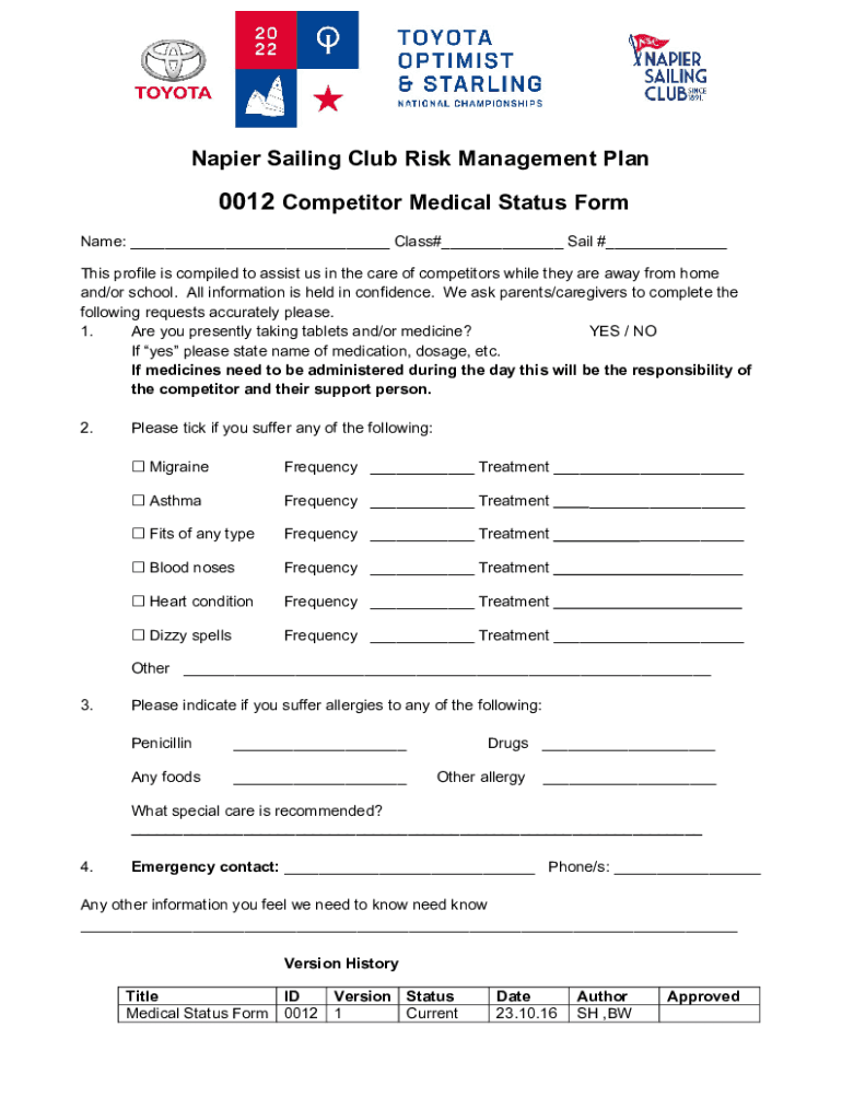 Napier Sailing Club Risk Management Plan0012 Competitor Medical Status Form Name: ___ Class#___ Sail #___ This profile is compiled to assist us in the care of competitors while they are away from
