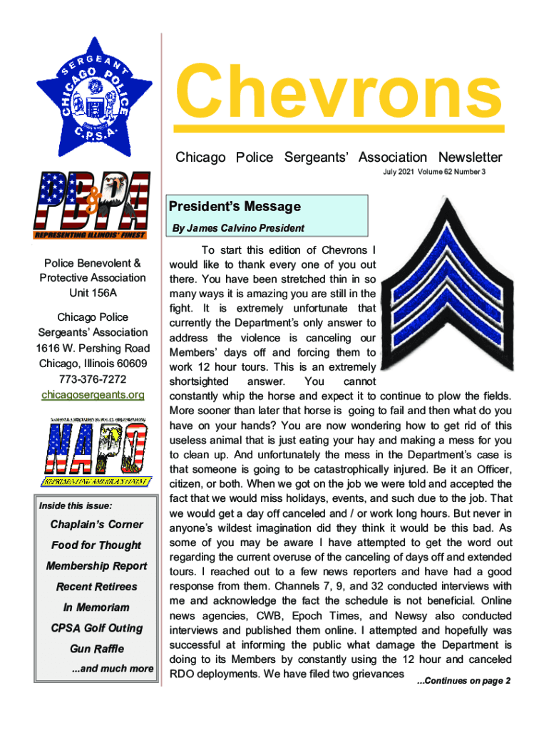 Chevrons Chicago Police Sergeants Association Newsletter July 2021 Volume 62 Number 3Presidents Message By James Calvin PresidentPolice Benevolent & Protective Association Unit 156A Chicago Police