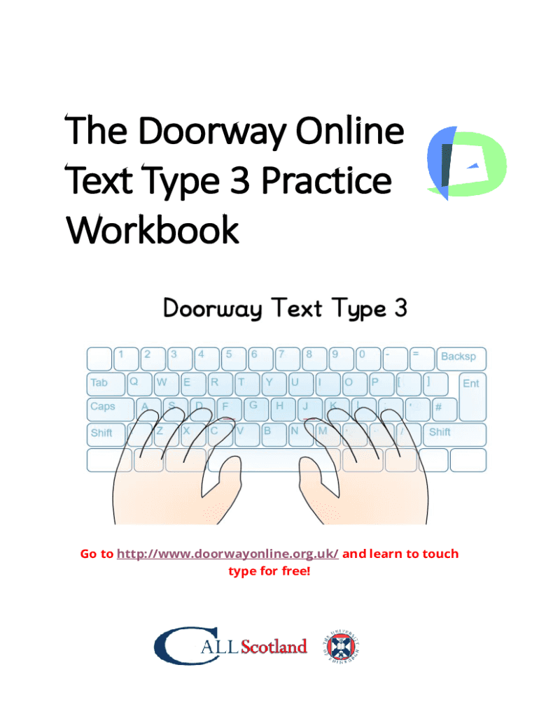The Doorway Online Text Type 3 Practice Workbooks to http://www.doorwayonline.org.uk/ and learn to touch type for free! Doorway Online is a touch typing tutor that takes learners from the home keys