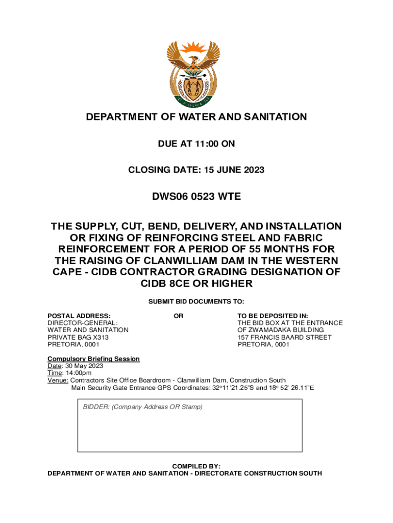 DEPARTMENT OF WATER AND SANITATION DUE AT 11:00 ON CLOSING DATE: 15 JUNE 2023DWS06 0523 WE THE SUPPLY, CUT, BEND, DELIVERY, AND INSTALLATION OR FIXING OF REINFORCING STEEL AND FABRIC REINFORCEMENT