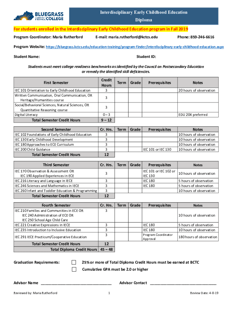 Interdisciplinary Early Childhood Education Diploma For students enrolled in the Interdisciplinary Early Childhood Education program in Fall 2019 Program Coordinator: Maria RutherfordEmail: maria.rutherford@kctcs.eduPhone: