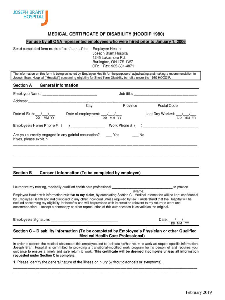 MEDICAL CERTIFICATE OF DISABILITY (HOODIE 1980) For use by all ON represented employees who were hired prior to January 1, 2006, Send completed form marked confidential to:Employee Health Joseph Brant