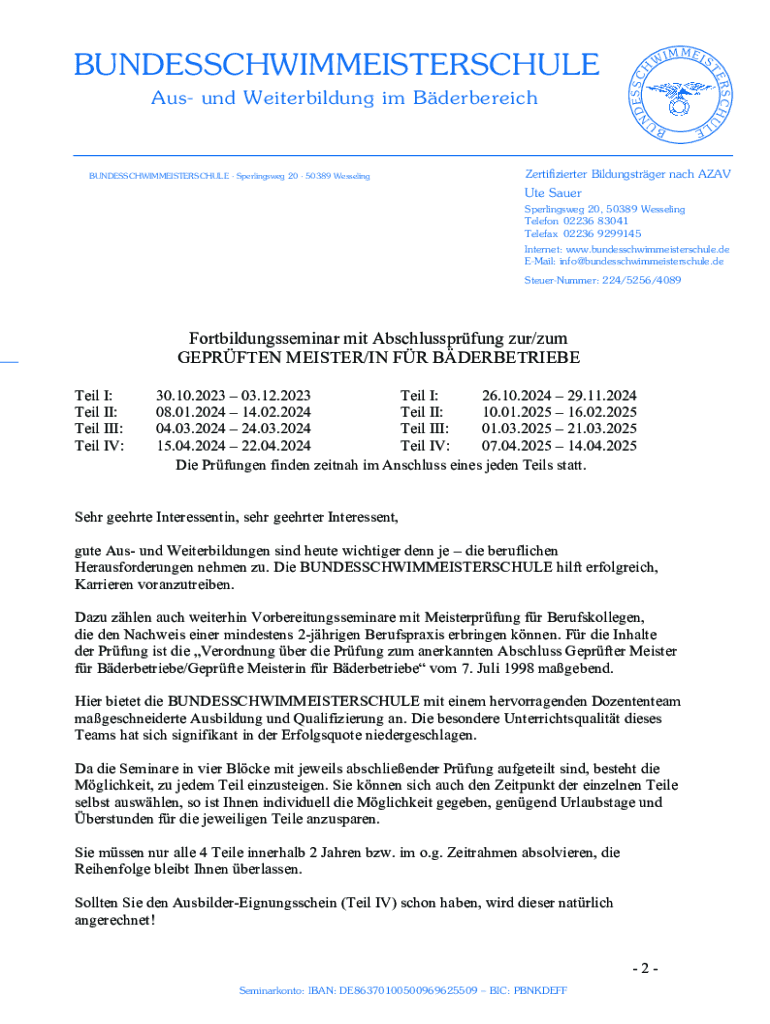 BUNDESSCHWIMMEISTERSCHULE Sperlingsweg 20 50389 WesselingRSCHUAus UND Weiterbildung I'm BderbereichIMMEIS