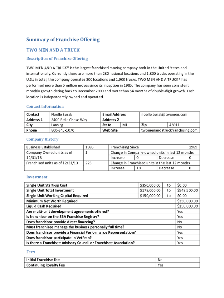 Summary of Franchise Offering TWO MEN AND A TRUCK Description of Franchise Offering TWO MEN AND A TRUCK is the largest franchised moving company both in the United States and internationally. Currently,
