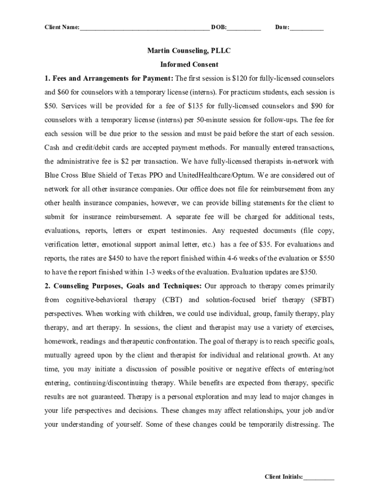 Client Name:___ DOB:___Date:___Martin Counseling, LLC Informed Consent 1. Fees and Arrangements for Payment: The first session is $120 for fully licensed counselors and $60 for counselors with a temporary