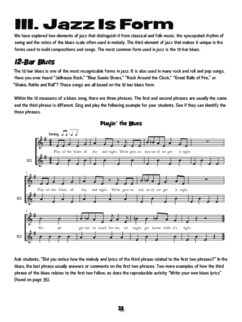 III. Jazz Is Form have explored two elements of jazz that distinguish it from classical and folk music: the syncopated rhythm of swing and the notes of the blues scale often used in melody. The third
