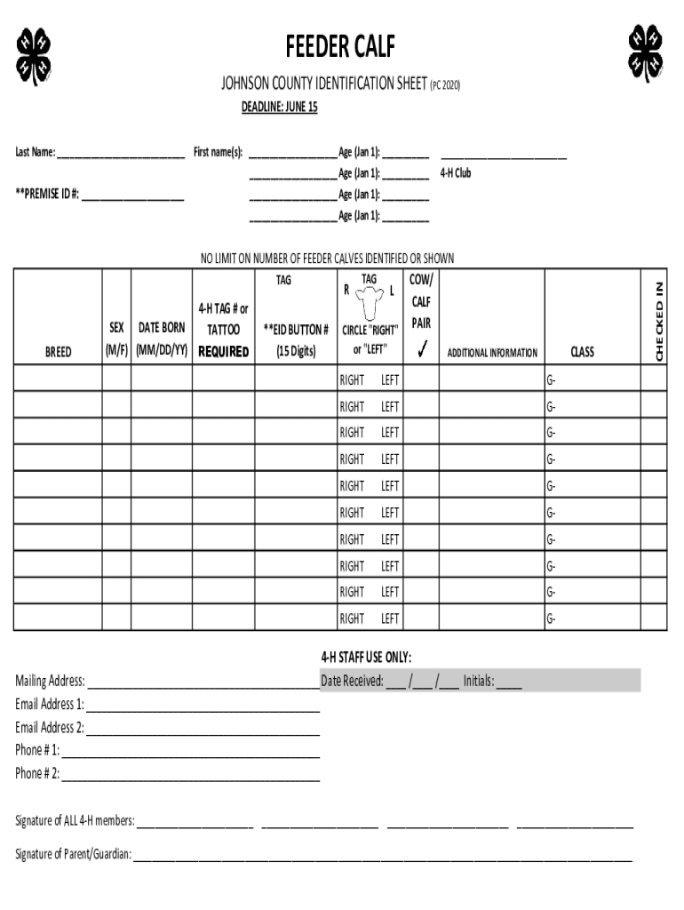FEEDER CALFJOHNSON COUNTY IDENTIFICATION SHEET (PC 2020) DEADLINE: JUNE 15**PREMISE ID #: ___BREED SEX DATE BORN (M/F) (MM/DD/BY)First name(s): ___ Age (Jan 1): ___ ___Age (Jan 1): ___ ___Age (Jan