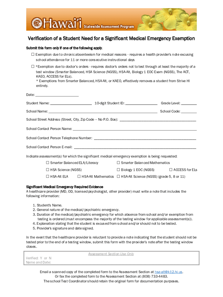 Verification of a Student Need for a Significant Medical Emergency Exemption Submit this form only if one of the following apply. Exemption due to chronic absenteeism for medical reasons requires