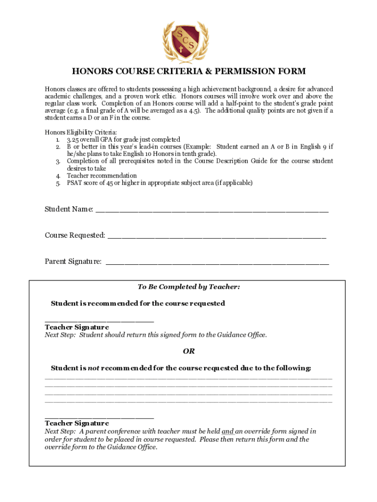HONORS COURSE CRITERIA & PERMISSION FORMHonors classes are offered to students possessing a high achievement background, a desire for advanced academic challenges, and a proven work ethic. Honor courses