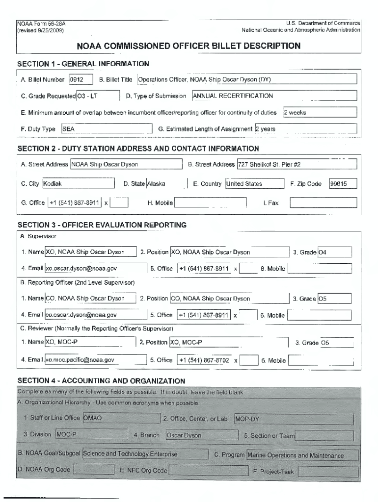 U.S. Department of Commerce National Oceanic and Atmospheric Administration NOAA Form 5628A (revised 9/25/2009)NOAA COMMISSIONED OFFICER BILLET DESCRIPTION SECTION 1 GENERAL INFORMATION A. Billet
