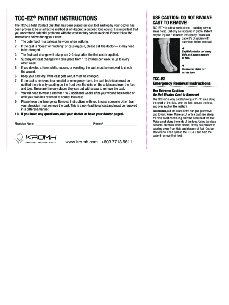 Perforation LineTCCEZ Patient InstructionsSagittal anterior cut along tibia and across dorsum of foot. Physician Name:___ Phone #___TCC EZ is a total contact cast padding only in areas noted. Cut