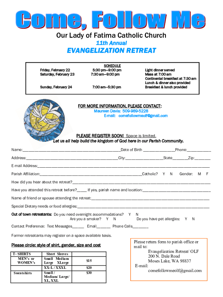 Our Lady of Fatima Catholic Church 11th AnnualEVANGELIZATION RETREAT Friday, February 22 Saturday, February 23SCHEDULE 5:30 pm9:00 pm 7:30 am9:00 pm Sunday, February 24Light dinner served Mass at
